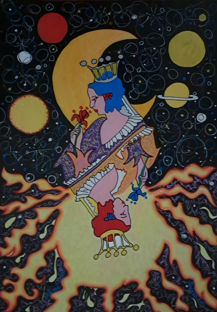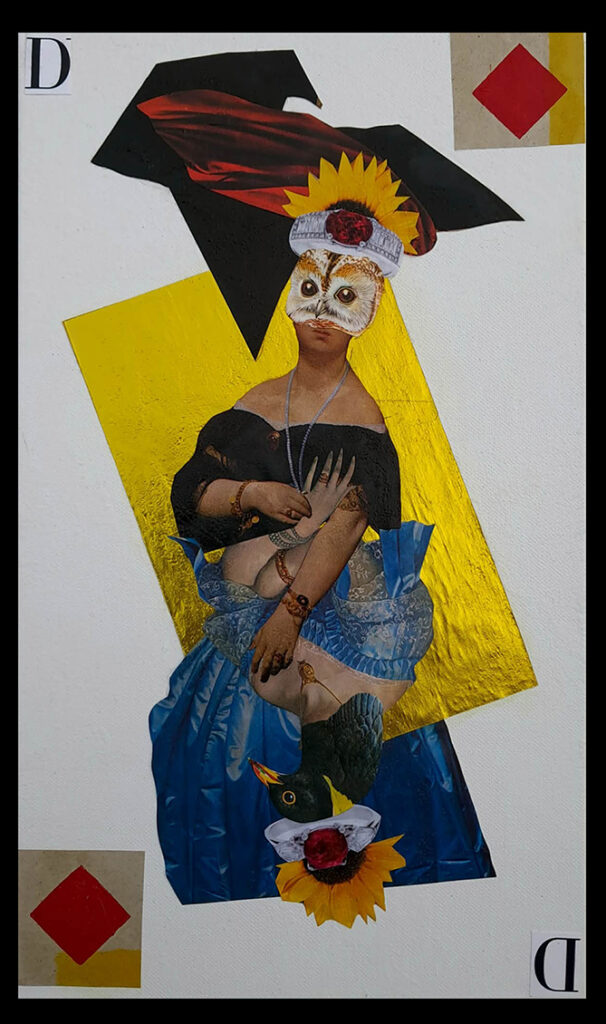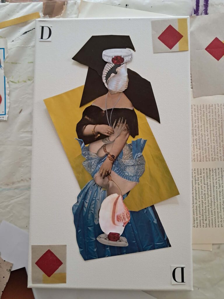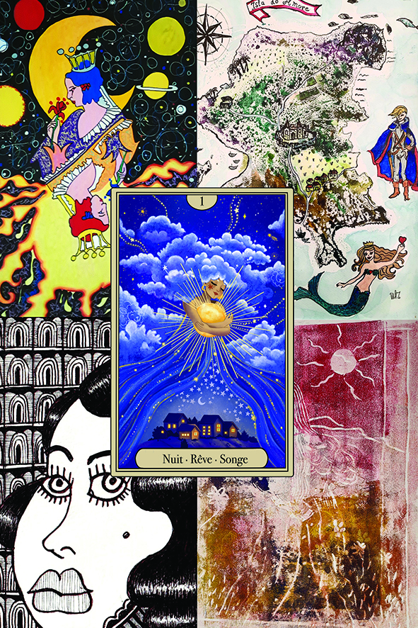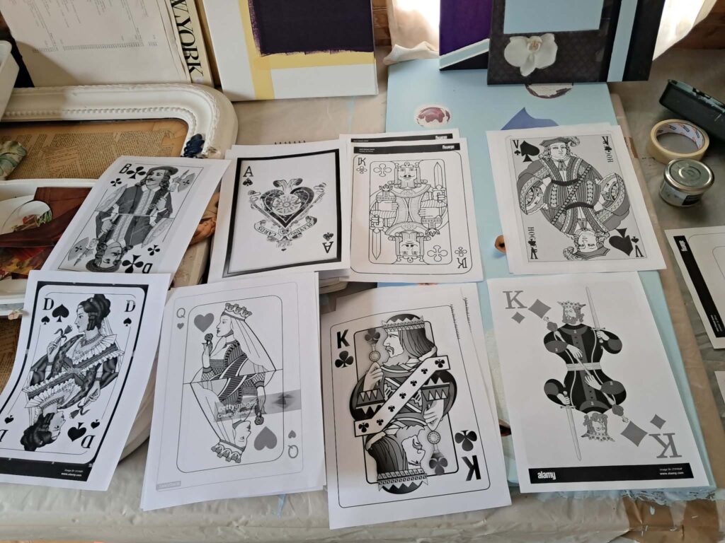 Les œuvres exposées sont créées sur la thématique des cartes ( à jouer, divinatoires, cartes du Tendre, …).